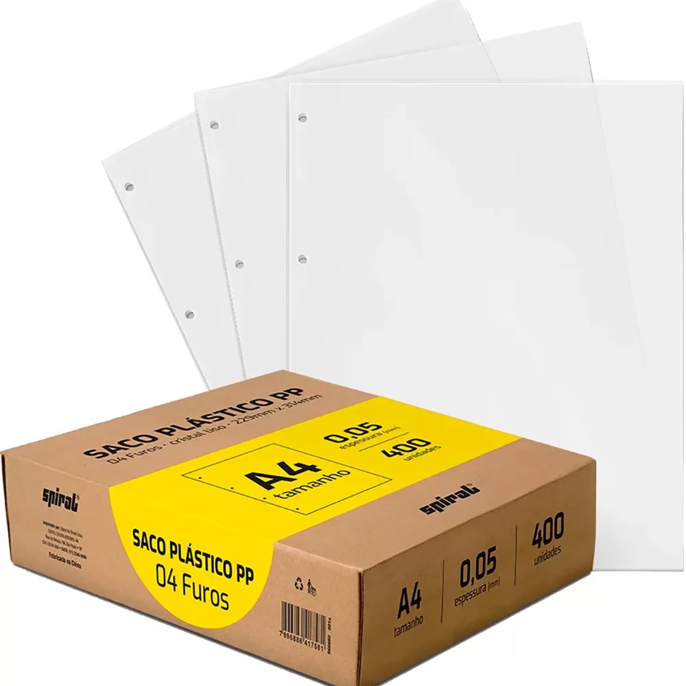 • O saco plástico 4 furos da Spiral é ideal para utilização em fichários, listas de preços e pastas catálogo.