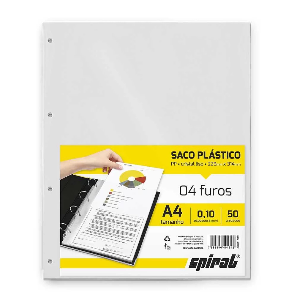 • O saco plástico 4 furos da Spiral é ideal para utilização em fichários, listas de preços e pastas catálogo.